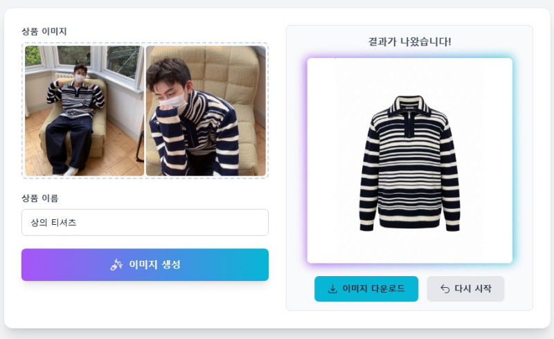 - 결과 항목 1: AI가 구겨져 있거나 다른 소품에 가려져 보이지 않던 면까지 재구성하여 360도 완벽한 니트 스웨터 이미지 생성
