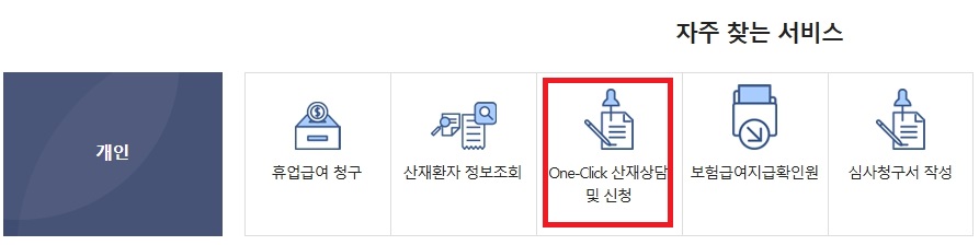 근로복지공단에서 운영하는 고용/산재보험 토탈서비스 → [사업장/사무대행기관/의료기관/개인] 탭 중 '개인' 클릭 → one-click 산재상담 및 신청 → 요양신청 을 따라가신후 ‘초진소견서’와 함께 ‘최초요양신청서’를 작성·날인하여 접수신청