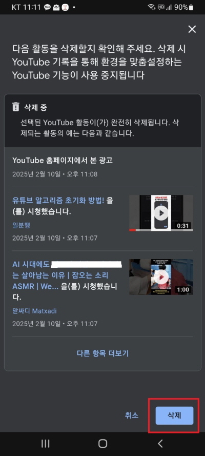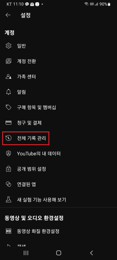 - '전체 기록 관리'를 선택한 후 '시청 기록 삭제' 및 '검색 기록 삭제' 실행
