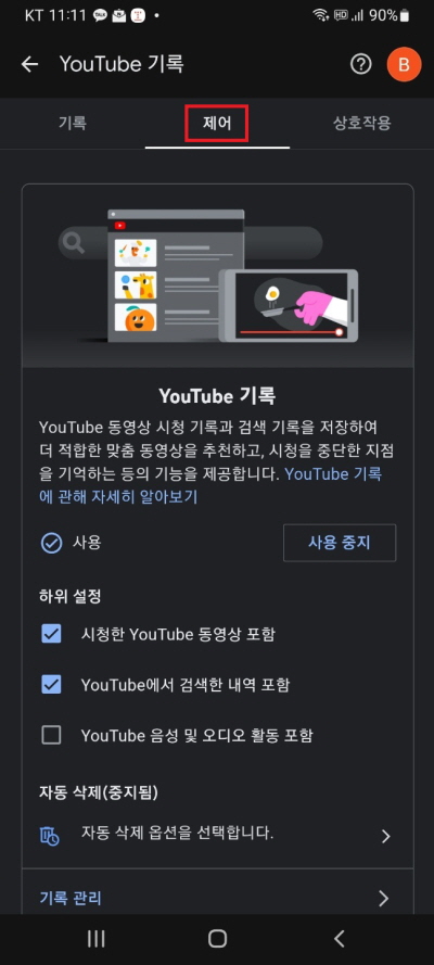 유튜브 설정에서 '자동 삭제' 기능을 활용하면, 일정 기간이 지난 기록을 자동으로 삭제할 수 있습니다. 3개월, 18개월, 36개월 중 원하는 기간을 선택해 보세요.