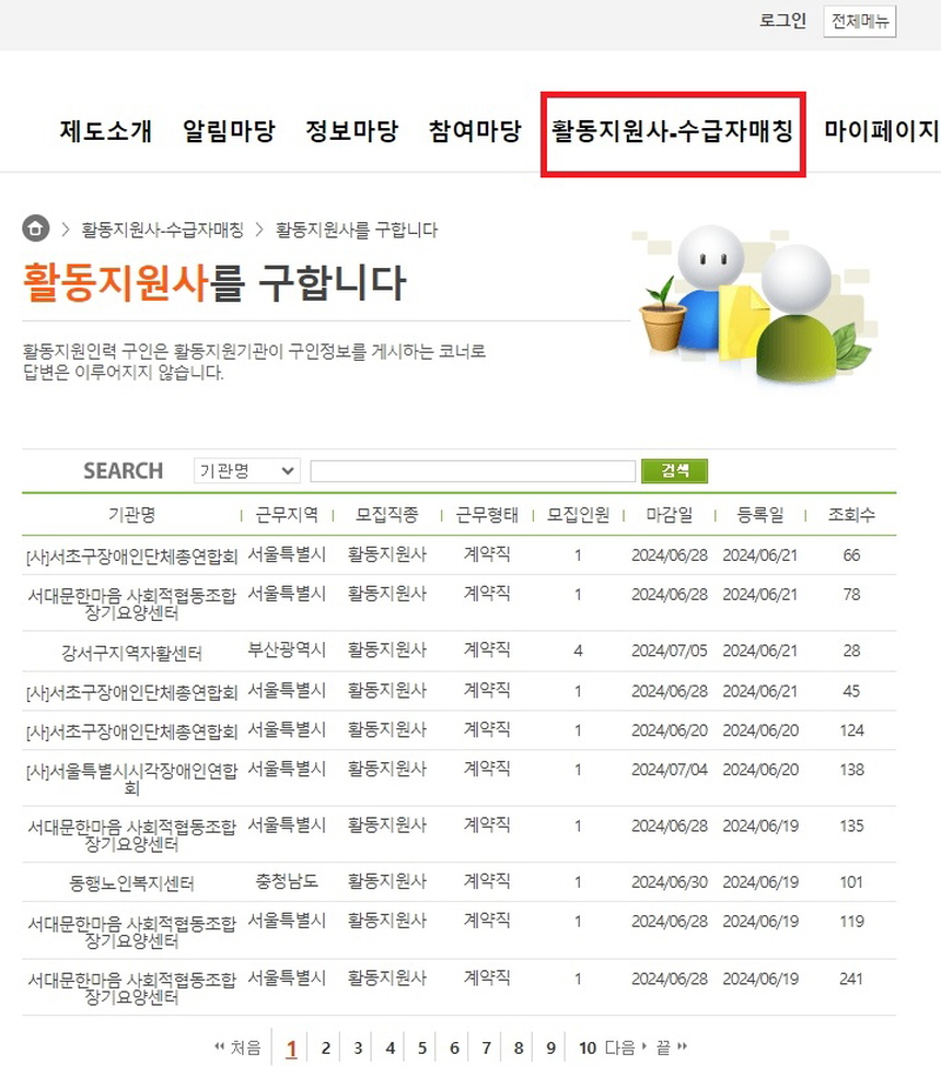 취업 역시 장애인활동지원센터에서 가능합니다 회원가입 후 아래처럼 활동지원_수급자매칭창을 활용하여 활동지원사 구직이 가능합니다.
