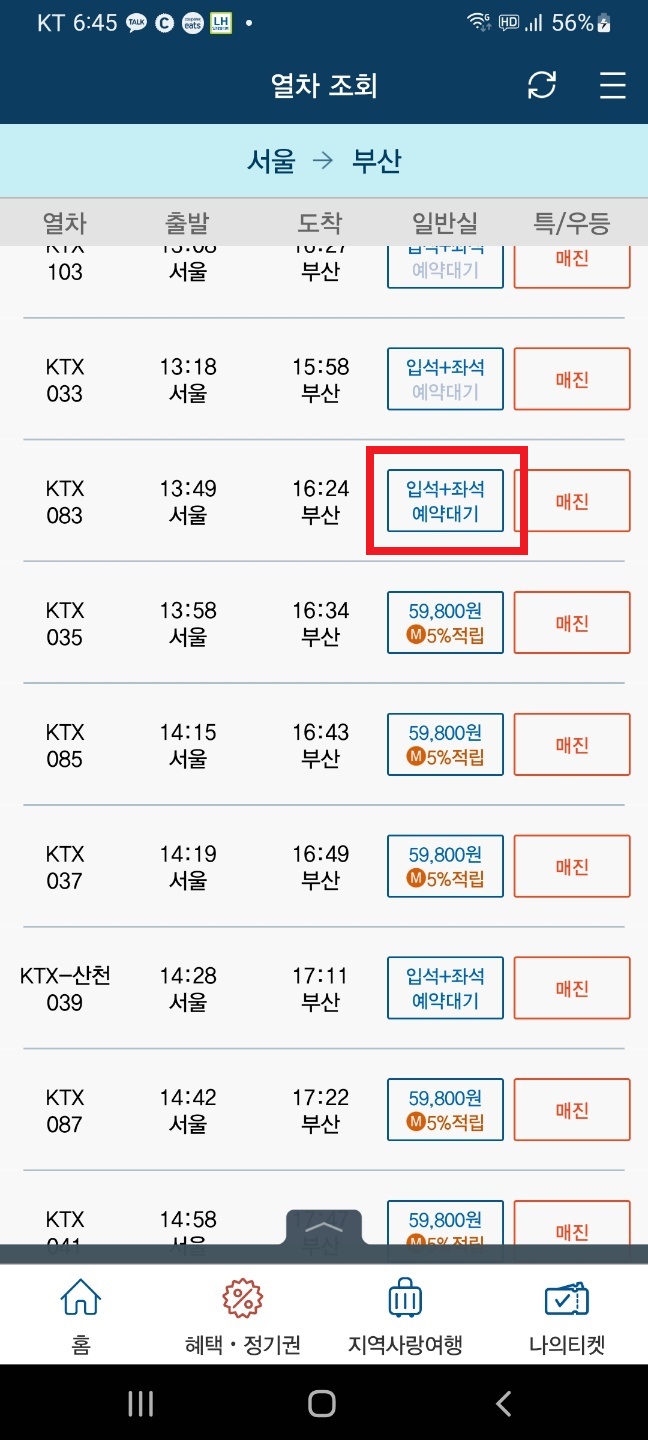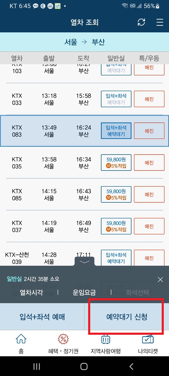 - 매진된 열차 중 "예약대기" 버튼이 있는 것을 찾아 클릭합니다.