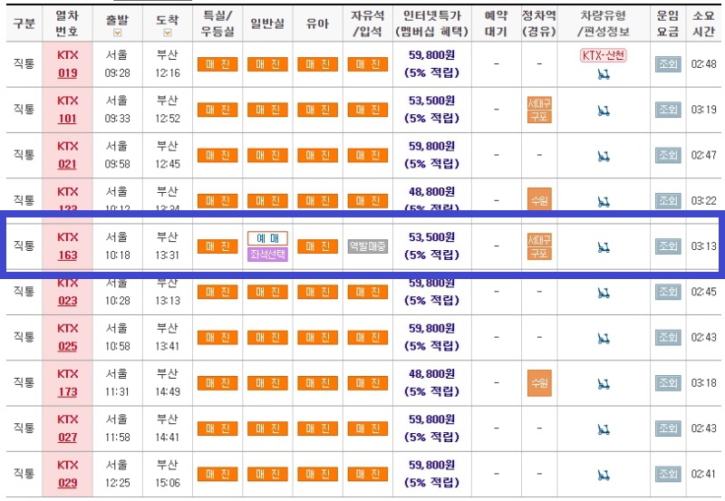 - 특실도 괜찮다면 두 개의 체크박스를, 일반실만 원한다면 아래 체크박스만 선택합니다.