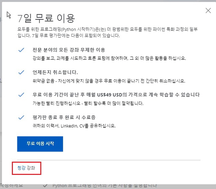 4). 세부강좌 중 하나를 클릭하면 나오는 '무료로 등록' 버튼을 다시 클릭한후 뜨는 팝업창의 '청강강좌'을 클릭하면 됩니다.