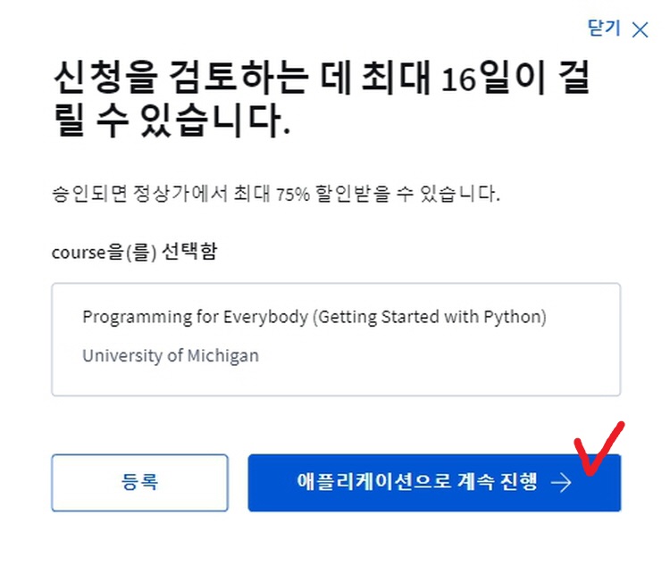 지원요청할 강좌를 선택 후 검토기간(최대 16일)과 지원범위를 안내받은 뒤 '애플리케이션으로 계속 진행'을 클릭 후 신청서 작성을 시작합니다.