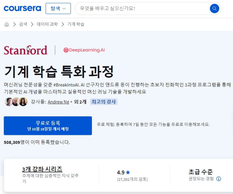 2. 스탠포드 대학의 "기계 학습 특화 과정" (Machine Learning)